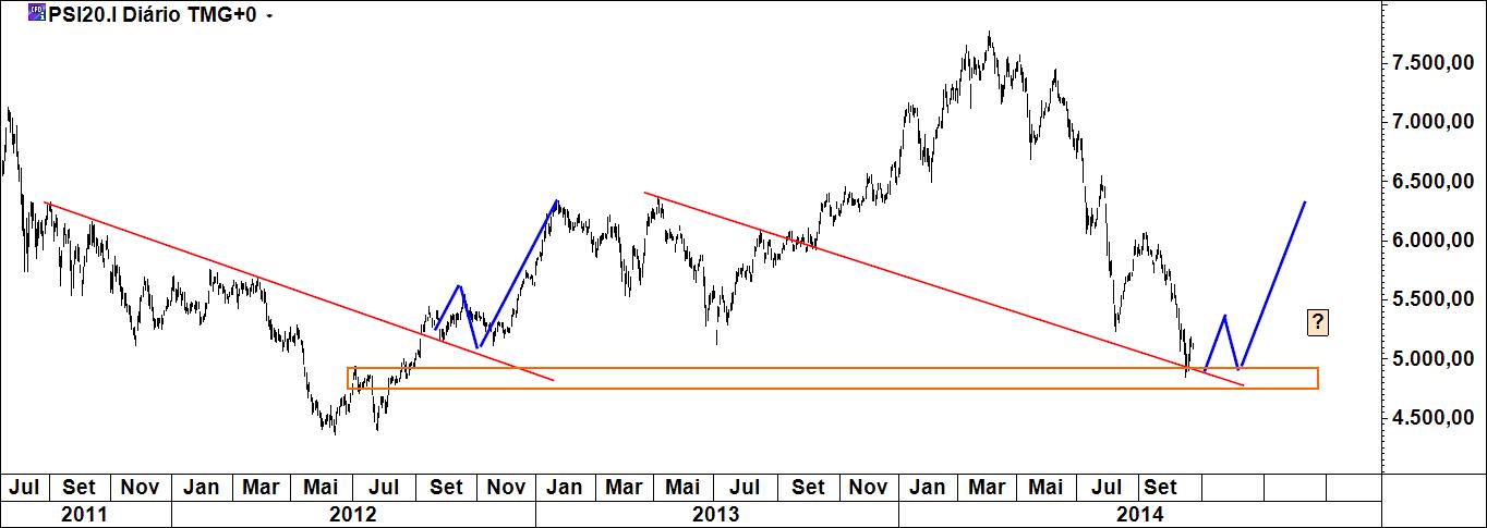 No dia 23 e 24 de Outubro de 2014 coloquei neste fórum os gráfico 1, 2 e 3. Apenas para memória futura hoje coloco o gráfico 4 para se poder constatar a evolução do preço após ter penetrado na área que havia assinalado. Por ser tão bonito até penso colocar num dos meus tópicos.