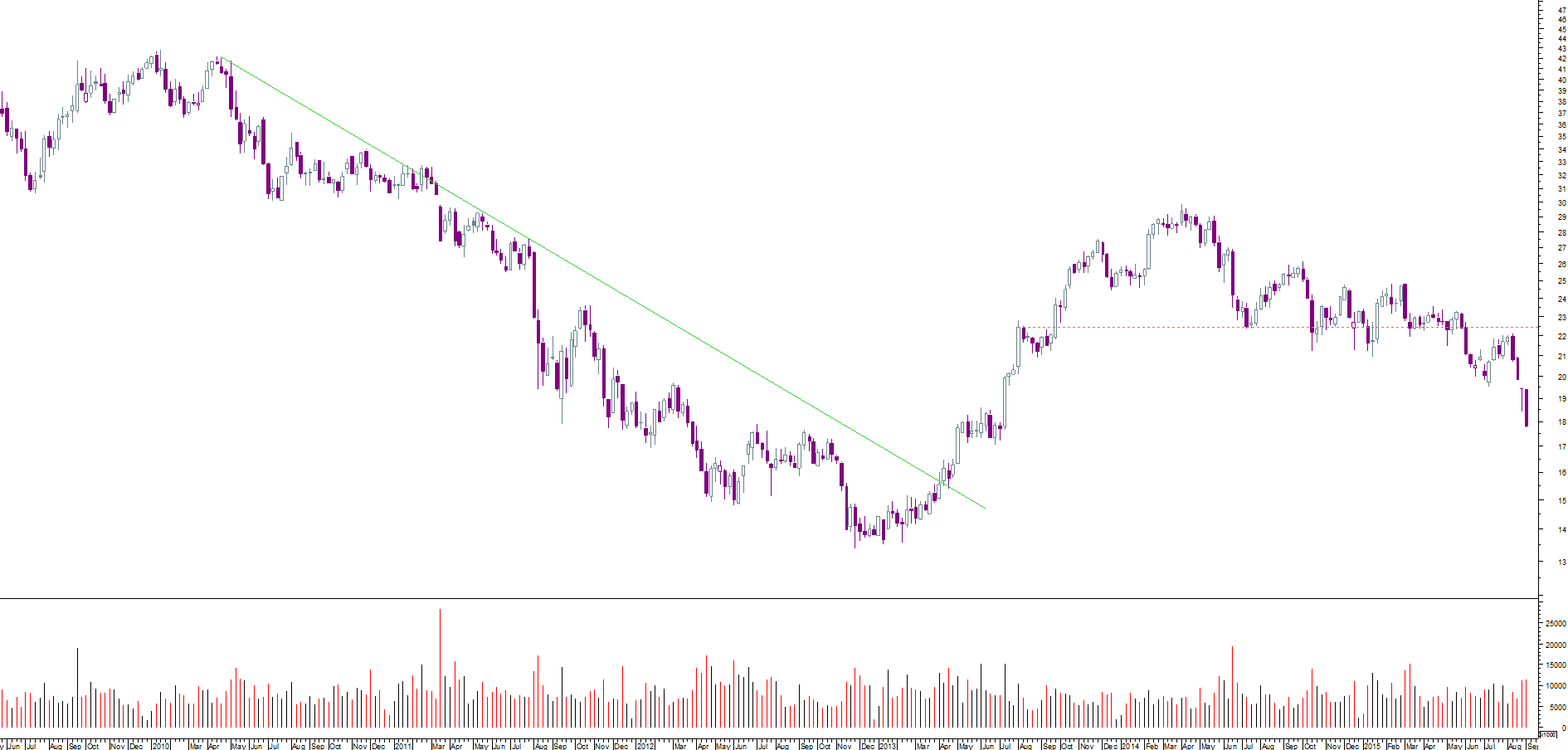 No gráfico Semanal vê-se que a MM200 tem servido de suporte mas vem fazendo topos e fundos mais baixos.