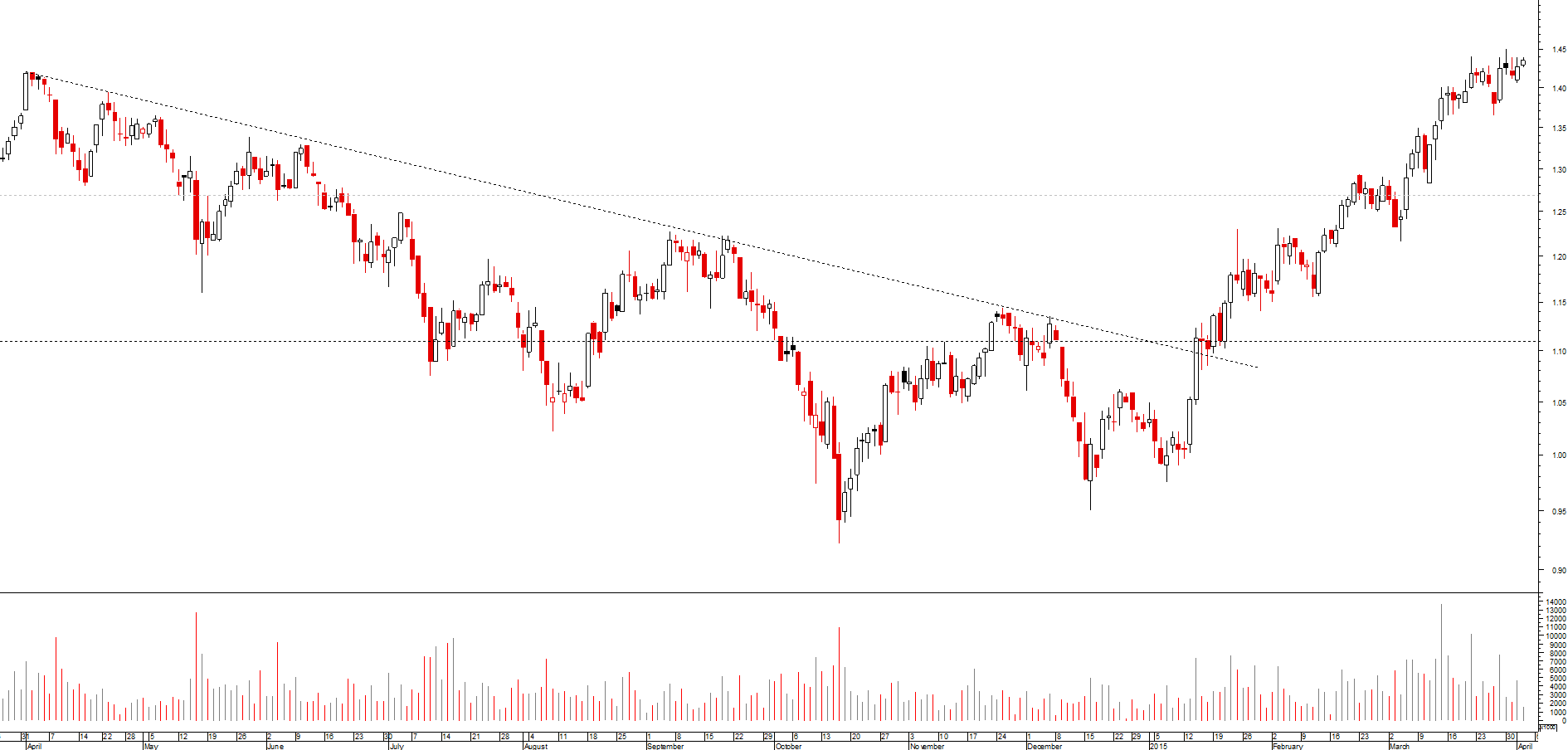 Está certo Ulisses,o que queria reforçar é que mesmo a sonae passando a resistência dos 1,4 como pareçe estar a fazer,tem esta ainda que penso será válida,pois não existe intersecçao gráfica da cotada neste ponto olhando para a esquerda,mas tu poderás confirmar isso bem melhor que eu.Se preferires a meu ver,tem este range 1,4~1,5 para superar.