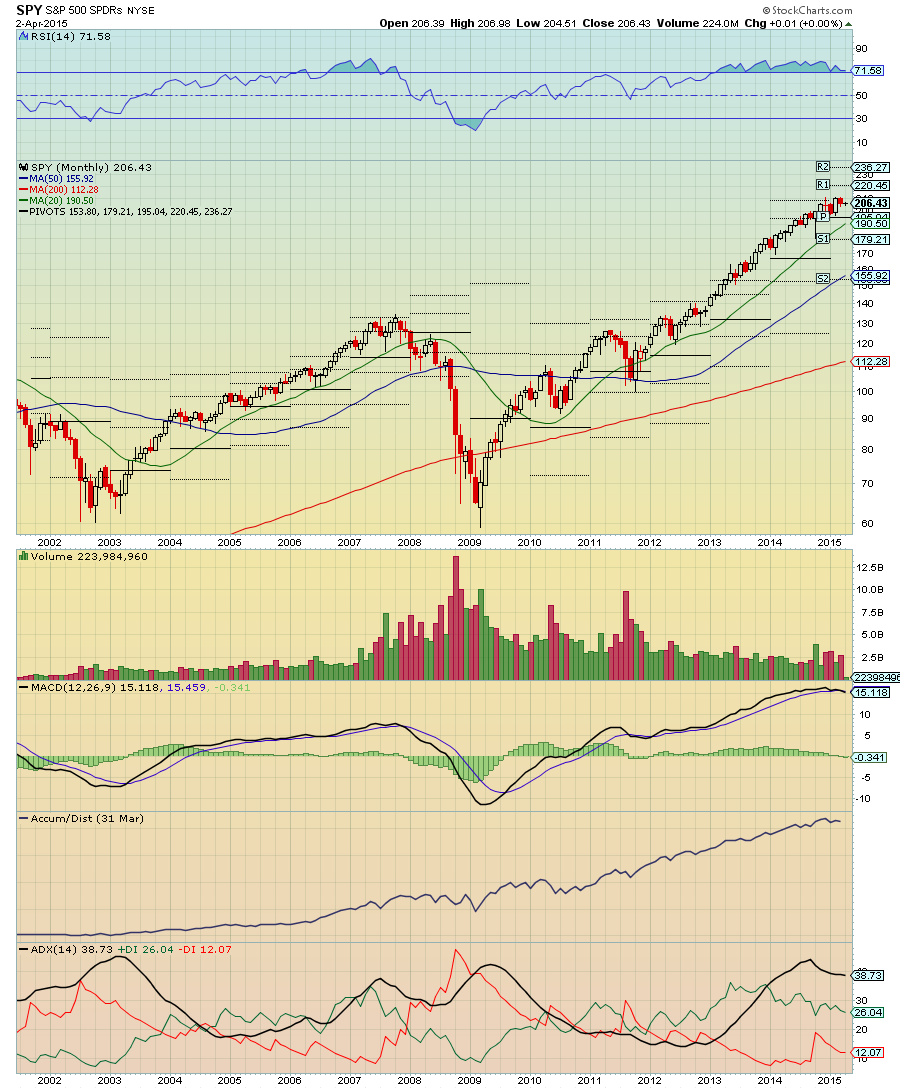 Por vezes andamos distraídos com o curto prazo / médio prazo. E que tal visualizar o gráfico mensal do SPY. Não acham que o RSI e o MACD merecem alguma atenção ?