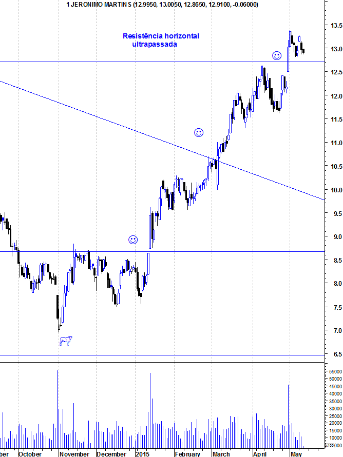 Aqui ficam os gráficos actualizados da Jerónimo Martins numa altura em que a acção está a consolidar acima da resistência quebrada.