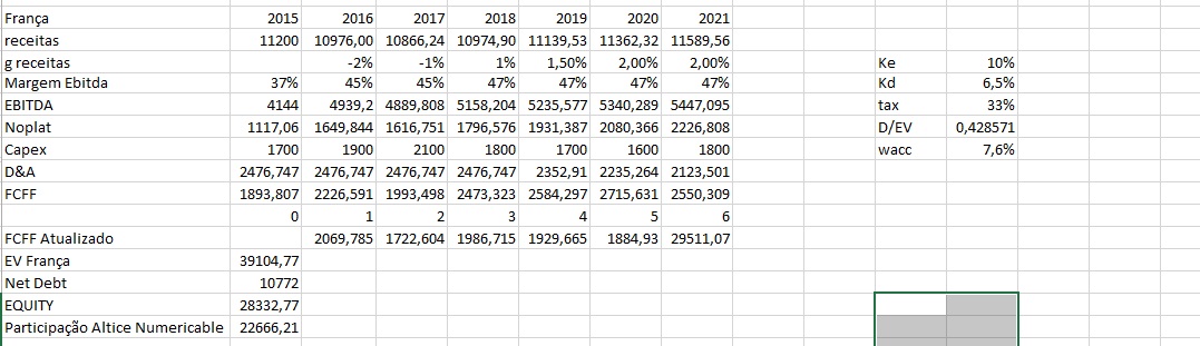 a altice finalmente ! eu vendi o que tinha não acredito que a ATC compre a timewarner, a altice está sobreavaliada em 25% já incluindo todos os guidances de cortes de custos e de aumento de margens ebitda, o problema é o setor ser muito competitivo, assim sendo a atc vale 25,5mm de euros e está cotada a 32 logo é excessivo, na avaliação que fiz a equity nao foi a valor de mercado mas a taxa de desconto aplicada à mesma foi superior a atual. A compra da suddenlink nao foi incorporada pois o ev/ebitda da operação pos sinergia foi em linha com o justo valor da Altice e isso numa operação financiada por divida nao cria valor nenhum adicional. A altice nos eua será sempre um player de segunda acho que sonharam alto de mais, foram se meter num mercado muito competitivo e após anos de bull market....... se por acaso a altice comprasse a twc e dependendo do preço mudaria de ideias. Dizer que eles são bons executores a cortar custos e a meter empresas competitivas, mas a meu ver não tem calado para o mercado dos EUA, podem comprar mais umas empresas de cabo pequenas mas é só isso....