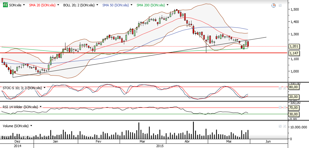 No dia 29 maio a sonae fez um novo cruzamento descendente das medias moveis(3,8,20) no grafico semanal o que passei de emocional "comprado" para "vendido",ou aguenta por aqui alguns dias ou se descer uns pós mais, será para shortar.