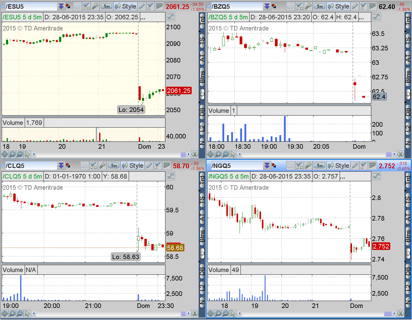 Nos últimos 30 dias exatamente tenho me dedicado apenas a 5 ativos: o /ESU5 , DWTI, UTWI ,DGAZ, UGAZ bear ou bull no petróleo e gaz via ETF alavancados. Repete-se a dose sobre os DWTI e DGAZ, o mini futuro SP500 hoje não estou para ai virado e para preencher essa lacuna há mais 4 ativos interessantes para a segunda-feira Grega e aproveita-se divide-se as comadres e os tempos aos dois lados do atlantico.