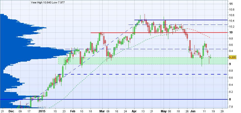 Apesar do mau aspeto entrei no final da sessão. O fundamento é só um, está em cima do suporte, se quebrar não cai nem o Carmo nem a Trindade, se o suporte cumprir a sua função, que é suportar, melhor. O Stop está abaixo da linha, não tenho target automático, mas estou a considerar a zona dos 9.45 paus.