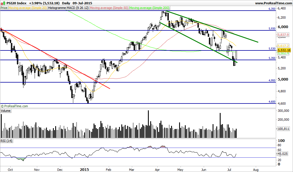 Hoje o PSI 20 subiu, quase, 4 %! Suponho que ainda descerá abaixo do nível a que fechou hoje e poderá tornar a testar aquele suporte.