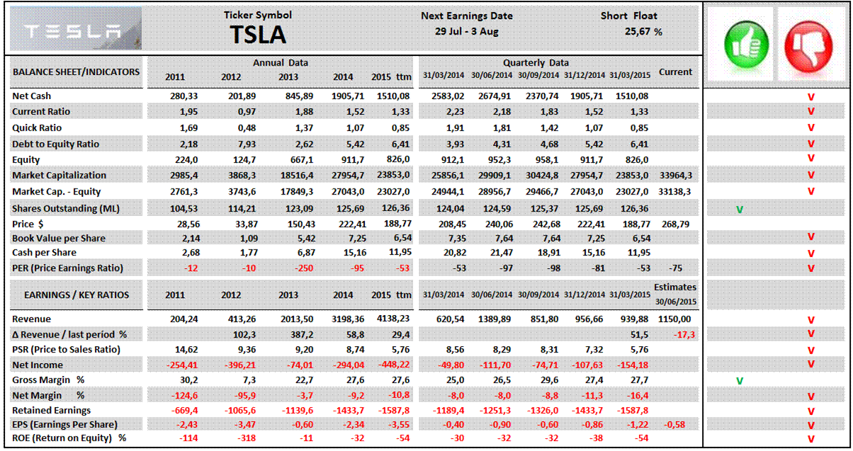 O Price Earnings Ratio (normalmente designado por P/E ou PER) é um dos indicadores mais utilizados pelos investidores para analisar o valor de uma ação. Representa a relação entre o seu preço e os lucros da empresa. Quanto mais elevado for o seu valor, mais cara deverá estar a ação (e, como tal, menos atrativa) e vice-versa. Repara que a TSLA sempre registou prejuízos, logo, sendo o PER resultante das fórmulas Cotação/EPS ou Mark Cap/Res Liq.,este será sempre negativo.