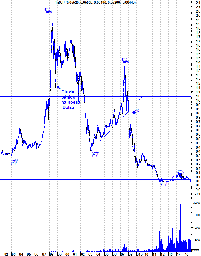 Em relação ao BCP, a acção retraiu na resistência dos 0,064 euros.. Enquanto não quebrar essa zona de resistência, os ursos continuam a dominar em todos os horizontes temporais. Recordo que os mais fantásticos ressaltos, historicamente, ocorrem em "Bear Markets".