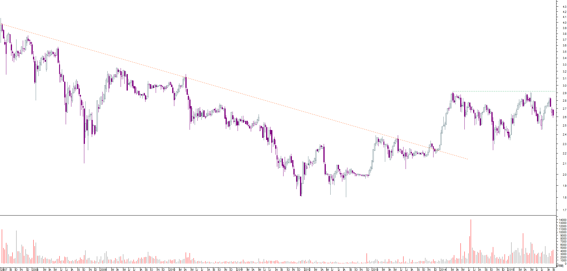 num gráfico semanal vemos o preço a oscilar ali entre os 2,86 e a mm200; suponho que ficará por aqui até ao final do ano.