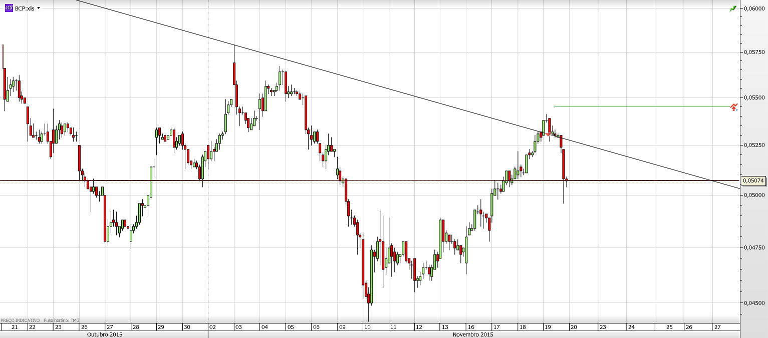 Na sequência do gráfico que apresentei no inicio da página, tive sinal e abri curto no BCP; provavelmente para fechar amanhã, veremos.