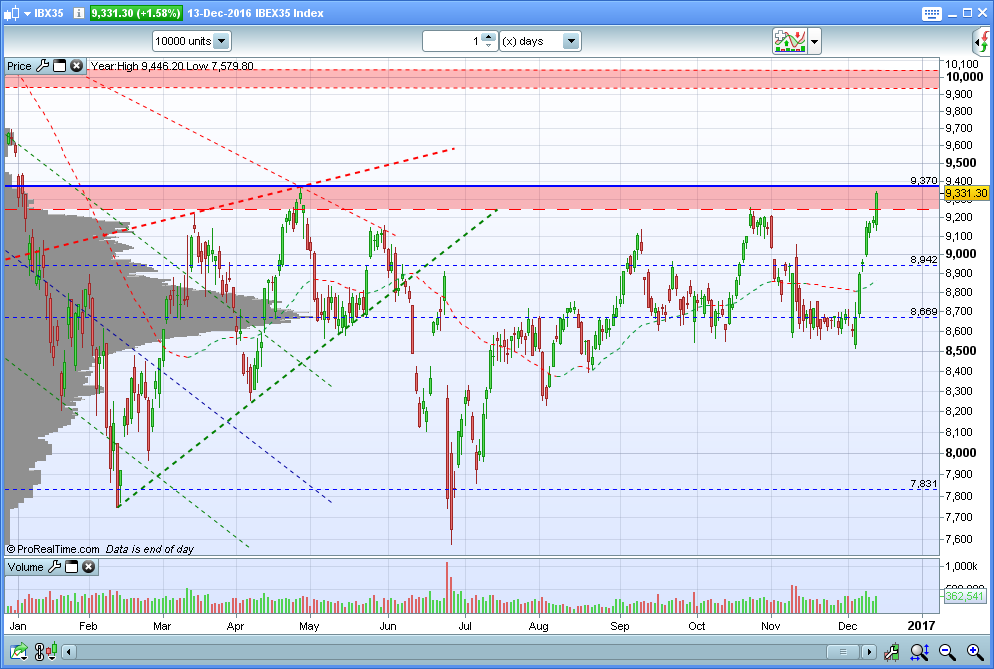 Após 3 anos de limpeza dos balanços, a trilogia Imobiliário em expansão, baixas taxas de juro e baixa inflação, faz com que o Sistema bancário esteja em explosão, com volumes apreciáveis (entradas de Fundos e especuladores de todo o Mundo), valorizações para níveis de 2012. Caixabank dobrou, BBVA eufórico, Liberbank o único que já está esticado, Bankia uma promessa, Sabadell forte potencial e o incrivelmente especulativo e perigoso Banco Popular pode brevemente efectuar 1 breakout até aos 1.2 (Os curtos estão a reduzir posições). FCC, Inditex, Telefónica e Enagás estão convincentes para mais uma Leg UP.