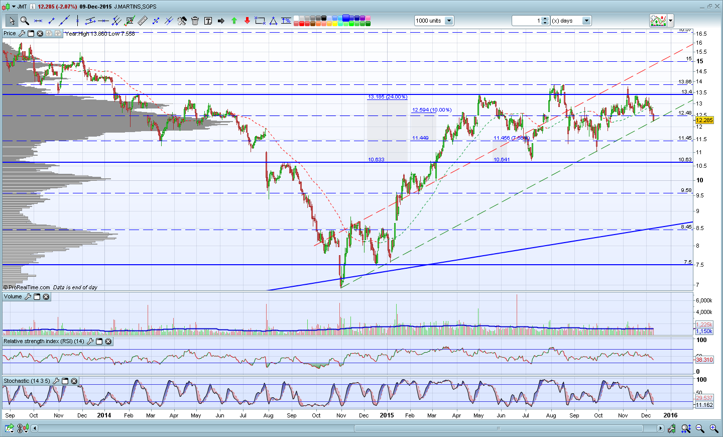A JM voltou a não conseguir superar a importantíssima resistência na zona dos 13,9 euros. Face à velocidade das quedas desta semana, um ressalto na próxima semana é provável mas quem está de fora deve esperar pela quebra da resistência como sinal de força.