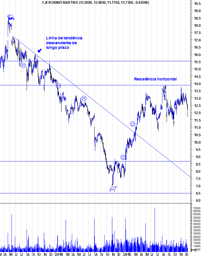 A minha interpretação do gráfico deste titulo leva-me a olhar atentamente para uma possível oportunidade de compra, isto é, caso esta zona dos 11,50 / 11.40 não seja quebrada em baixa, julgo que é um bom momento de compra, podendo leva-lo a médio prazo acima dos 14€, caso contrário, diria que a zona dos 10,60 / 10,50 será o próximo suporte, ou quem sabe, fechar os dois gaps ainda em aberto(Jan13 e 16, 2015), algures entre os 9.03 e os 8,525.