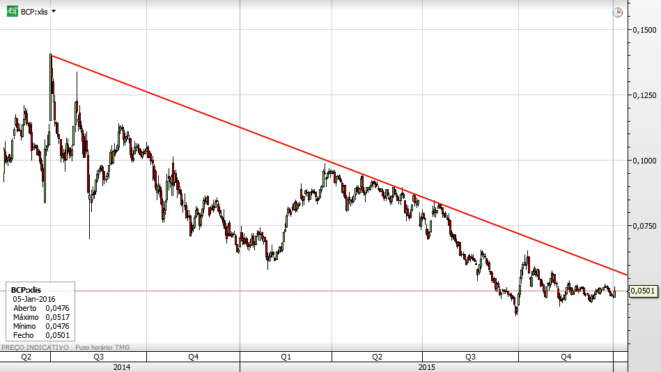 A tendência dominante sim, não mudou. Na altura eu apresentei as razões, havia sinais de curto prazo que podiam indicar uma viragem de tendência neste prazo mas nem isso se confirmou. Eu tinha colocado a hipótese de uma retração até aos 0,485/90 se os mercados caíssem nos dias seguintes. Mas os mercados subiram bastante e o BCP quase não se mexeu, por isso resolvi sair... eu olho apenas para os gráficos, é uma estratégia vulgar em quem usa a AT para investir. Não me interessa se já passou o Banif, ou se já pagaram ou vão pagar os Coco's, etc... também não me interessa se agora está acima ou abaixo do valor que comprei ou vendi, quando fecho uma posição acabou-se... até evito voltar a investir de imediato em títulos em que acabei de fechar totalmente uma posição, quer a tenha fechado com ganhos ou com perdas!