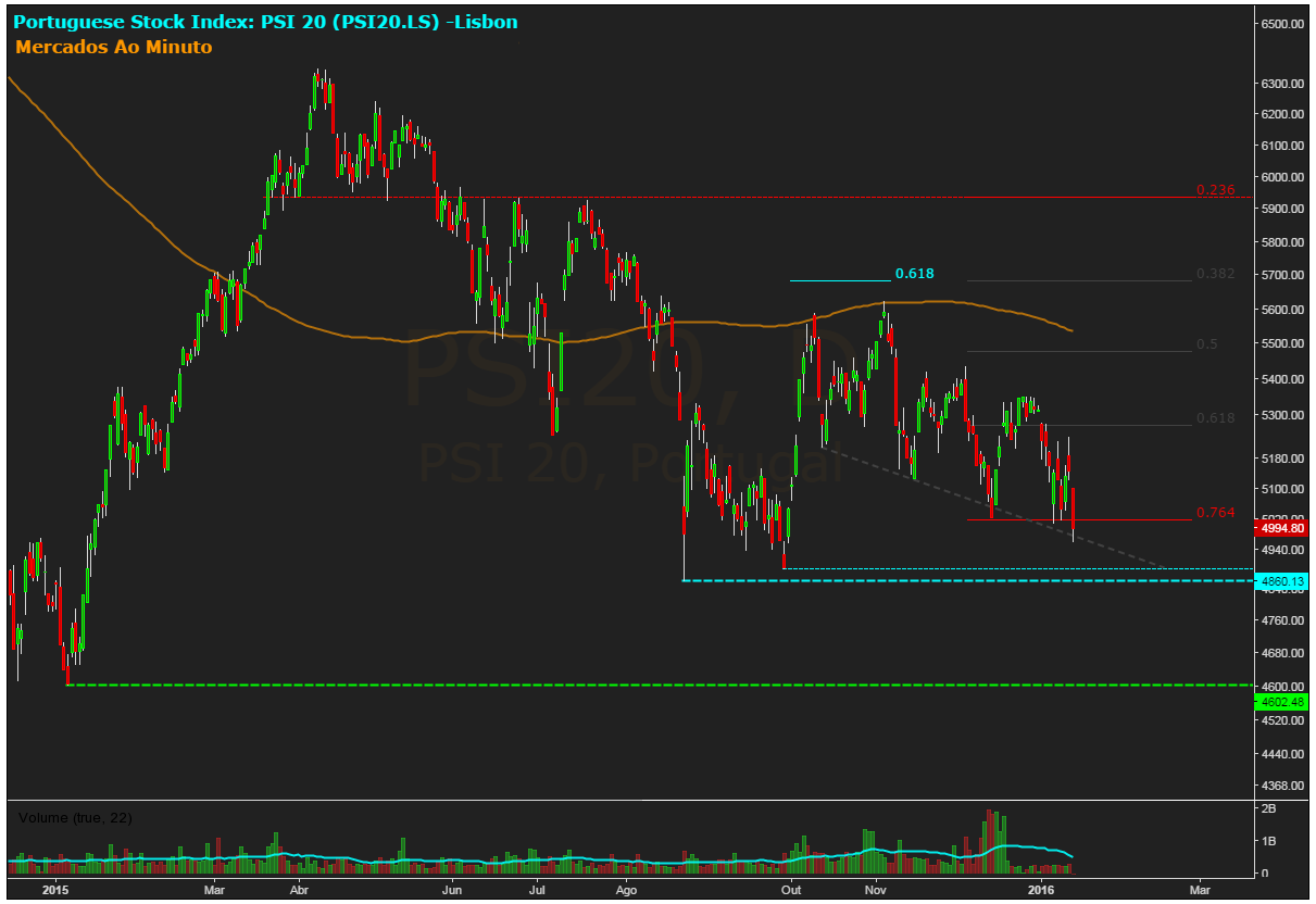 O preço aproxima-se da zona de suporte nos 4860 pontos, valor mínimo de Agosto de 2015.