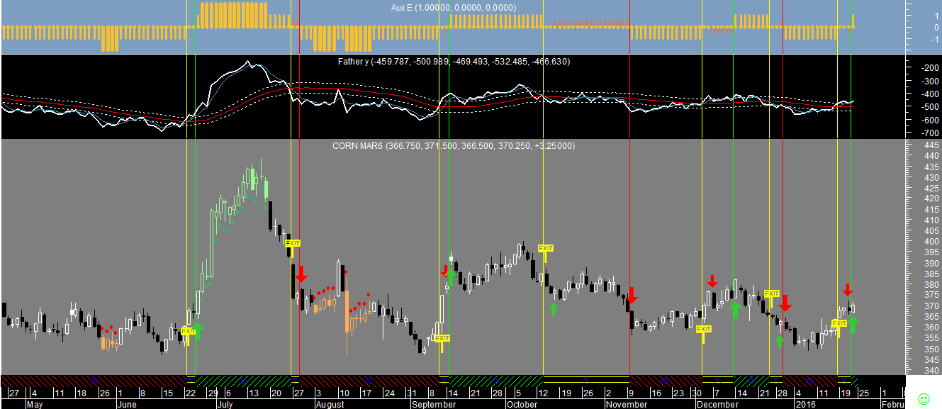 Voltando ao campo das commodities o sistema de trading no final da sessao de hoje assinala a passagem de curto para neutro no Corn (Milho), uma vez que acaba de disparar um sinal de compra na escala diária, o que, associado a uma venda no semanal, resulta numa posiçao final neutral.