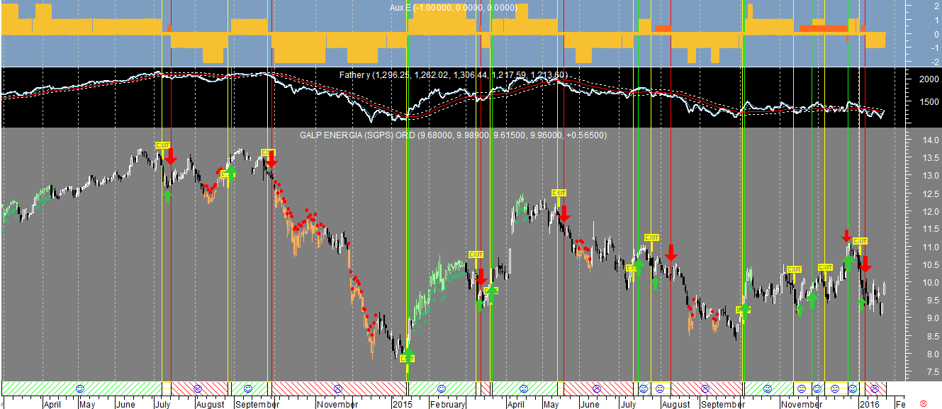 O papel seguinte também nao deixa de ser interessante em termos de diagnóstico geral, uma vez que se trata do caso da Galp, que possui uma tendência com posicionamento descendente na escala diária e uma tendência ascendente (!!!, na ótica do sistema de trading) que na prática anula a posiçao de compra ou venda mais aconselhada a tomar, concluindo-se daqui que para já o melhor é continuar de fora por enquanto e nao houver um consenso em ambas as escalas.