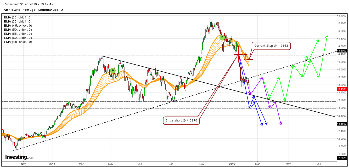 Entrei short nos ~4.38 euros dia 15/01 e o meu stop está agora nos ~4.25 euros. Vou fazendo a gestão da posição e actualizando o nível de stop.