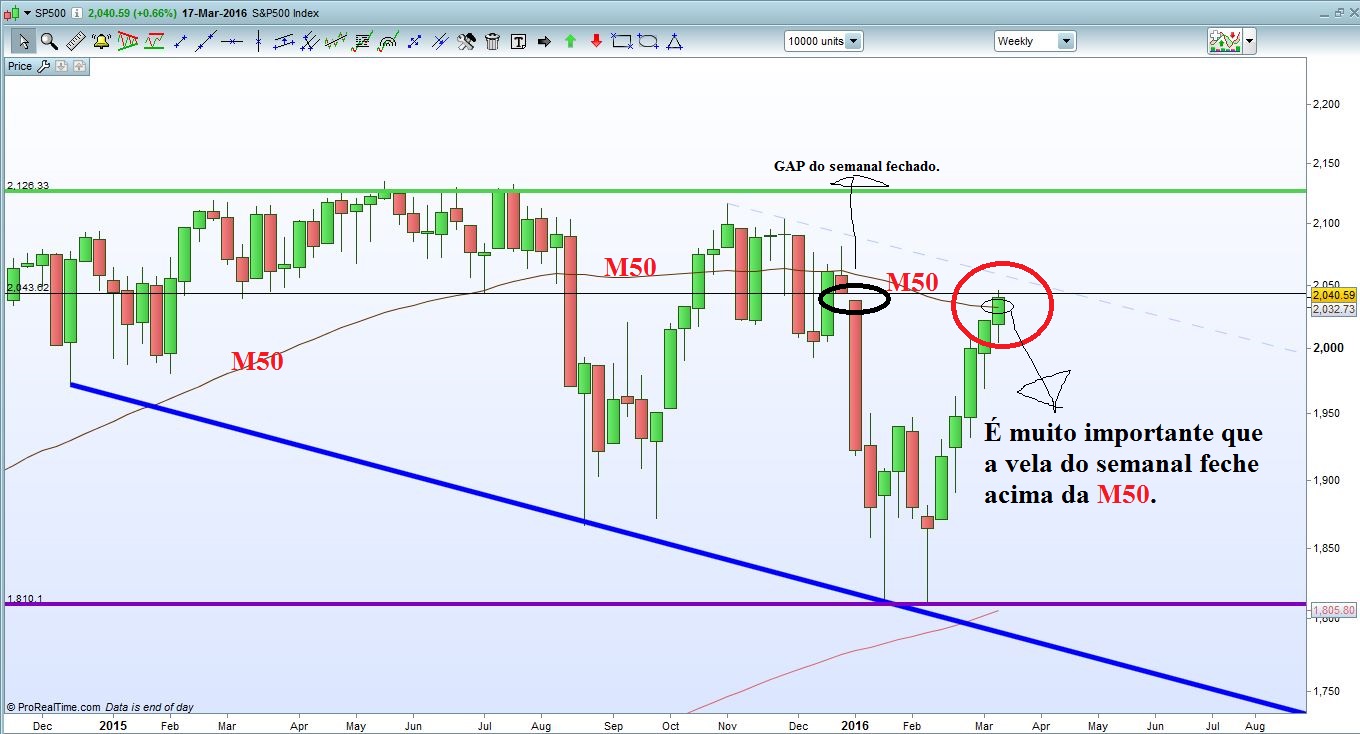 O S&P500 está a uma unhaca de fechar o GAP do semanal, mas o que me parece é que não existe nenhuma razão para que quando o fechar aconteça a tal famosa queda que tarda em acontecer. Pensando no modo Longo, que é aquele que me está a interessar para já, o dia de amanhã e de sexta são fundamentais, para além do fecho do GAP é importante que o Preço fique acima da M50 no semanal, se isso acontecer então acho que pode haver surpresas boas do lado longo.