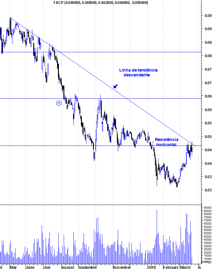 Tecnicamente, o BCP continua a lutar com a sua resistência horizontal e linha de tendência descendente.
