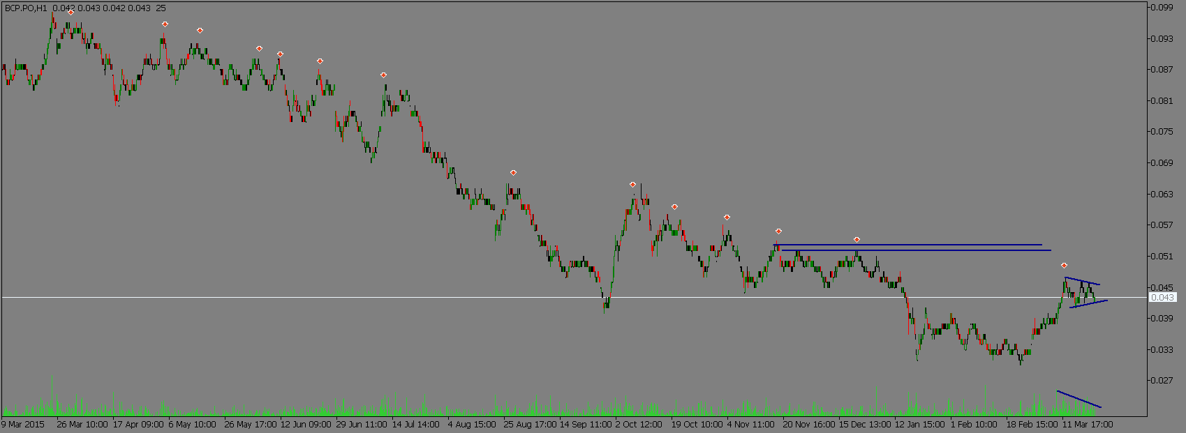 Acho que deves comentar mas dás demasiados alarmes onde não existem ... aqui os traders na sua maior parte seguem a A.T outros a A.F mas a A.T é sem dúvida a melhor ferramenta ... ligar a notícias ( RUIDO) faz de muitos pequenos investidores lerem alguns comentários e venderem sem ao menos verificar um gráfico. .. falando do BCP que é do que interessa no curto prazo fez um movimento interessante na quebra dos 0.0410 que era a sua resistência que agora será um teste ao suporte ... caso quebre não será difícil de perceber wue voltará para baixo ... mas eu como até sou optimista aponto para uma visita à resistência dos 0.052 e aí creio que haverá fortes entradas longas e perguntarão porquê? Bem é só ver o gráfico e perceber que quebra duas resistências num curti espaço de tempo ... Para quem decidir entrar longo quando a acção mostrar força Bull só na quebra dos 0.065 além de ser o valor do último grande A.C foi o que teve resistência pelo menos duas vezes uma boa noite e feliz pascoa