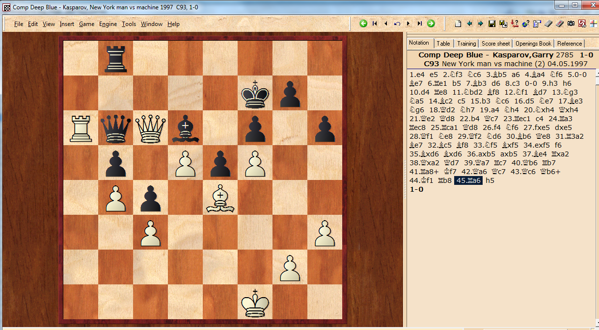 aliás ocorreu um episódio anedótico: numa Caro-Kan, se não estou em erro, o deep blue sacrificou uma peça e ganhou praticamente uma miniatura; lembro-me perfeitamente do Kasparov ter acusado a equipa do computador de ter feito batota, uma vez que aquele lance que o derrotou ser impossível de descobrir por ... uma máquina - algum grande mestre teria 'soprado' o lance ao computador