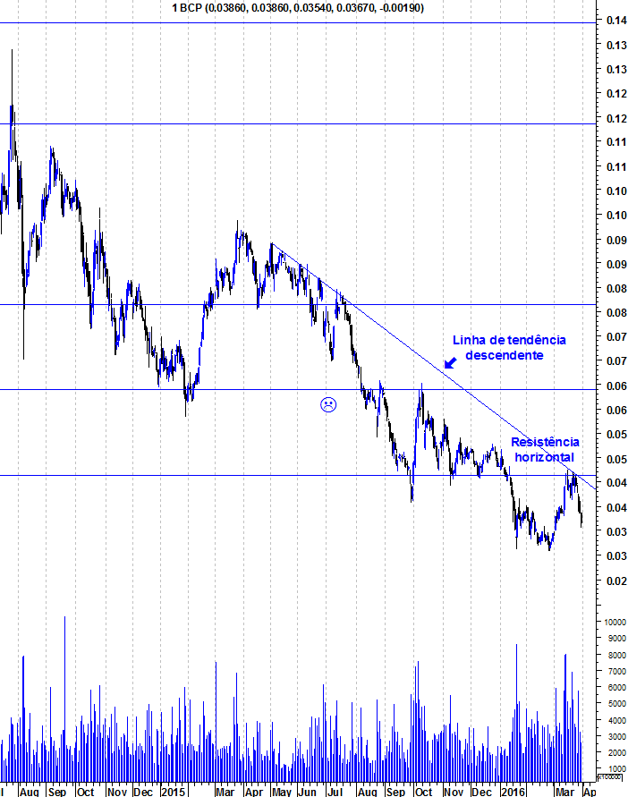 Ulisses Pereira Escreveu:Podemos estar aqui a dissertar sobre imensas coisas mas o BCP está a fazer em Bolsa aquilo que é normal nos últimos anos: Cair. Depois de um ressalto, a acção cai e segue a sua tendência descendente.
