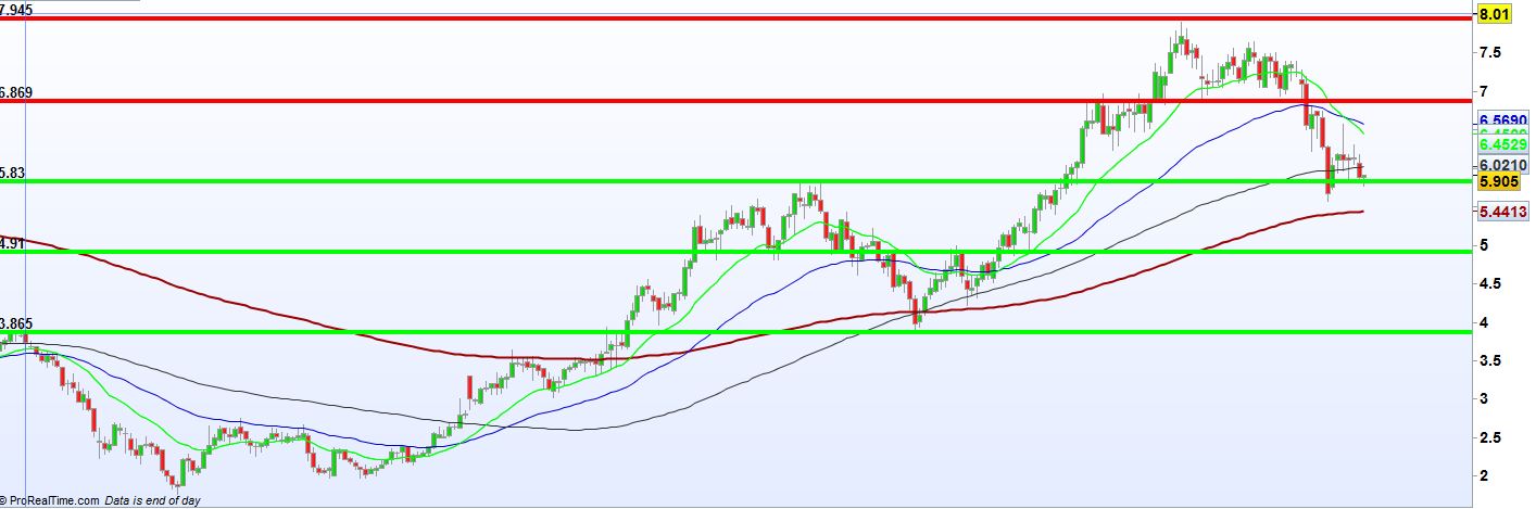 A minha leitura é um movimento de reacção à zona de suporte (5,70~) que já anteriormente mencionaram, decidi entrar nesses valores esperando que aguente, os indicadores já estão algo aliviados. Se quebrar fuginde