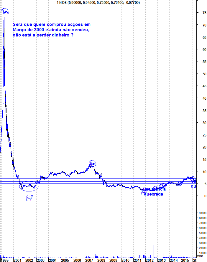 Ulisses Pereira Escreveu:johny, a minha resposta está muito em linha com a do ricardmag. Ou seja, a quebra do suporte entre os 6,85 e os 7 euros fez-me despir o meu fato de touro mas eu não visto imediatamente o de urso. Caso a Nos quebre consistentemente a zona de suporte entre os 5,7 e os 5,8 euros, então aí vestirei o meu fato de urso.
