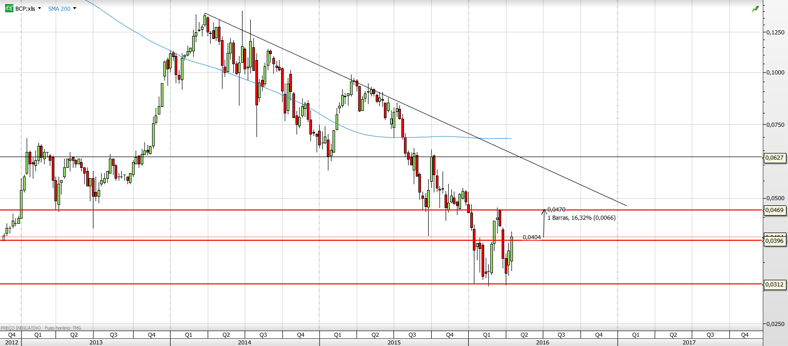 corre Escreveu:Concordo com a leitura do Paul invest, o BCP fez um duplo fundo e agora a cotação poderá atingir 0.05 no curto prazo. À parte este movimento técnico aquele aumento de capital para ir ao novo banco está muito mal explicado, parece-me uma coisa do tipo "agarrem-me, senão eu mato-o". Quatro mil milhões?!! Quando é que haverá algum retorno? E Angola continua a ser um problema... tenho sérias dúvidas que a Europa abrande a pressão. Até lá o BCP deverá continuar a subida iniciada na semana passada.