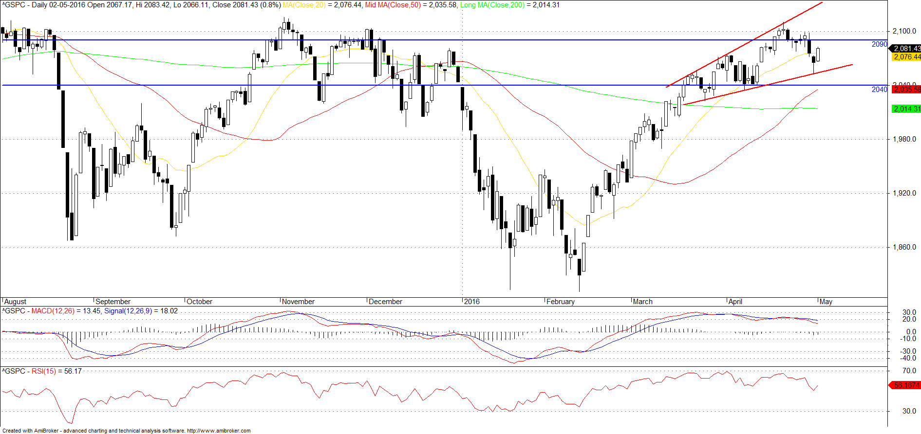 Quanto ao dia de hoje só não gostei de o fecho ter sido imediatamente abaixo daquela resistência/suporte dos 2081,56. Espero que isso não seja um mau sinal (penso que não).