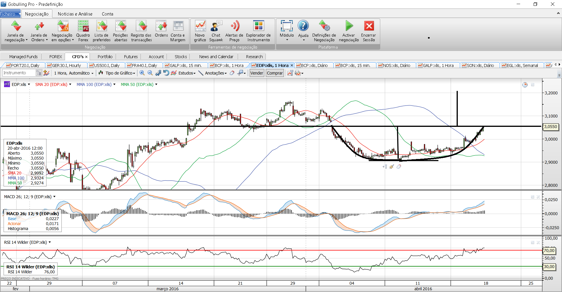 edp parece estar a formar uma inversão de tendencia no gráfico de 1 hora Rounding Bottom pattern