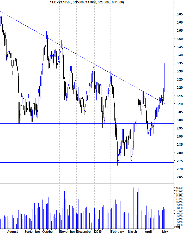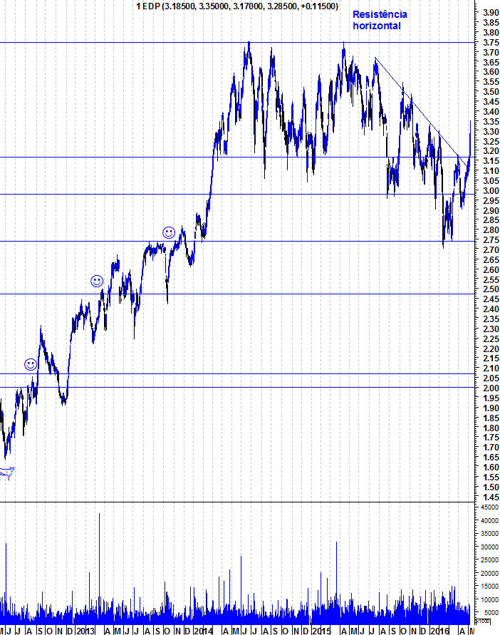 A EDP está a ter hoje um dia fantástico, quebrando a sua resistência horizontal, depois de já ter quebrado a LT descendente. Mais sinais de força da acção.