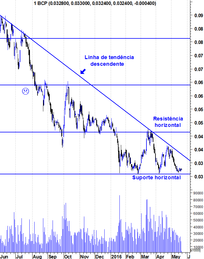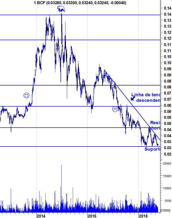 Abaixo de 0,03 euro, vai ser uma limpeza de "stops" fantástica e o espetro do BES e do BANIF provocará emoção forte e receio (na minha opinião, sem fundamento) de que algo parecido com o que sucedeu ao BES e ao BANIF ocorra com o BCP.
