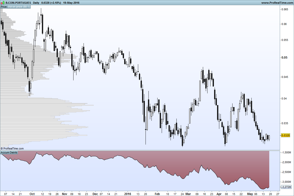 A tendência descendente é longa, a novidade é a diferença de comportamento na zona dos 0,031, ou seja, nas outras vezes a reacção foi muito mais rápida e com mais volume, logo nem é preciso ser expert em AT para perceber que a probabilidade de fazer novos mínimos é bem mais alta do que um ataque aos 0,04.