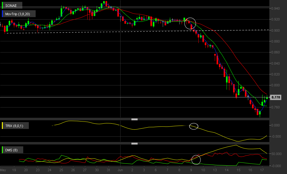 Boas colegas,deixo o grafico da sonae,tecnicamente perfeita...ainda sem qq sinal de compra,apenas o adx perdeu alguma força na venda,o que nao significa para já compra,trix vendido,mms idem,aguardemos o sinal