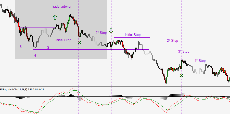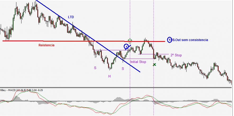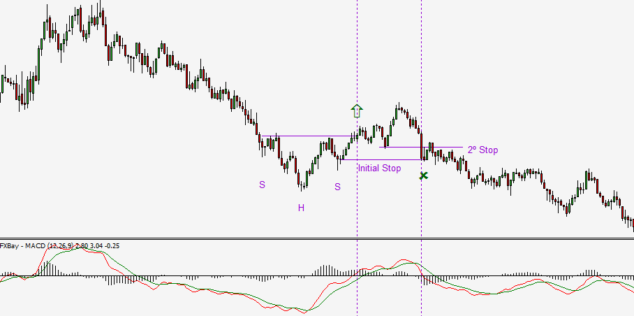 Razao de entrada- HS, entrada no breakout, primeira linha horizontal, ajuste do stop para o "2º Stop".