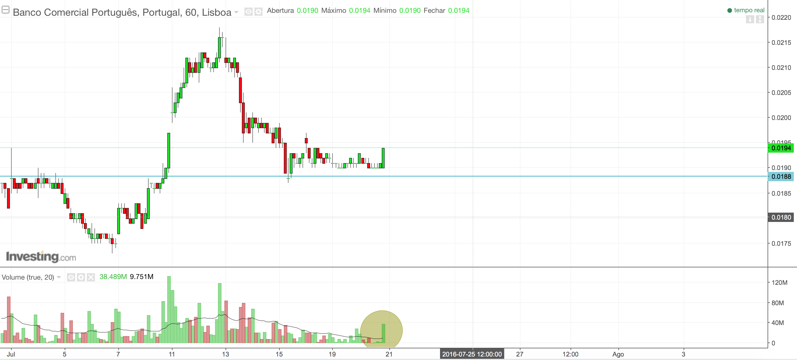 figurastecnicas Escreveu:Continua a lateralizarão no gráfico horário, suporte ligeiro aos 0,0188€ quase a ser testado, mas parece-me que sem novidades técnicas de momento.