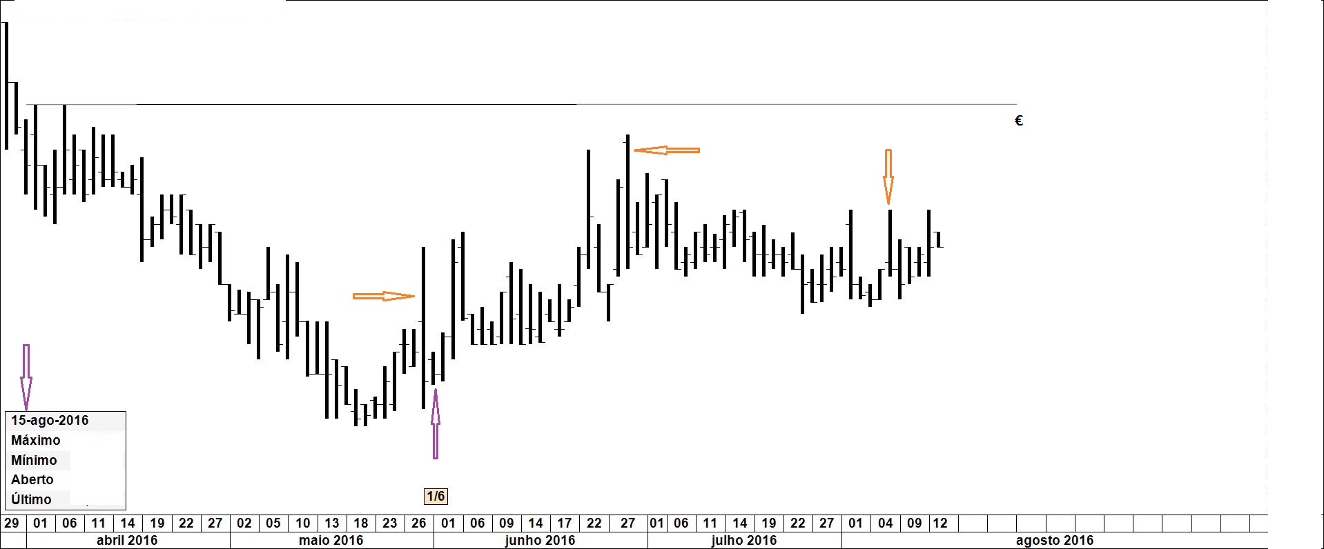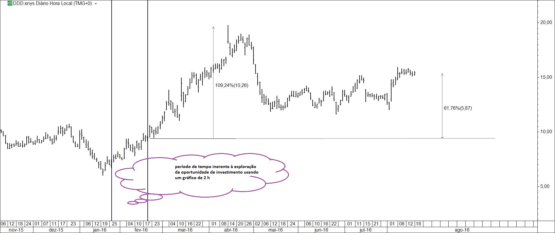 Quem teve a oportunidade de continuar o acompanhamento da ddd após o encerramento e a revelação do negócio nela executado pôde, na melhor das hipóteses, duplicar o investimento em pouco menos de 2 meses. Evidentes razões técnicas, uma das quais se apresenta no gráfico 2, teria justificado o encerramento da posição nesse momento. Presume-se que quem manteve o investimento estará satisfeito. Um prémio, portanto, para os não distraídos.