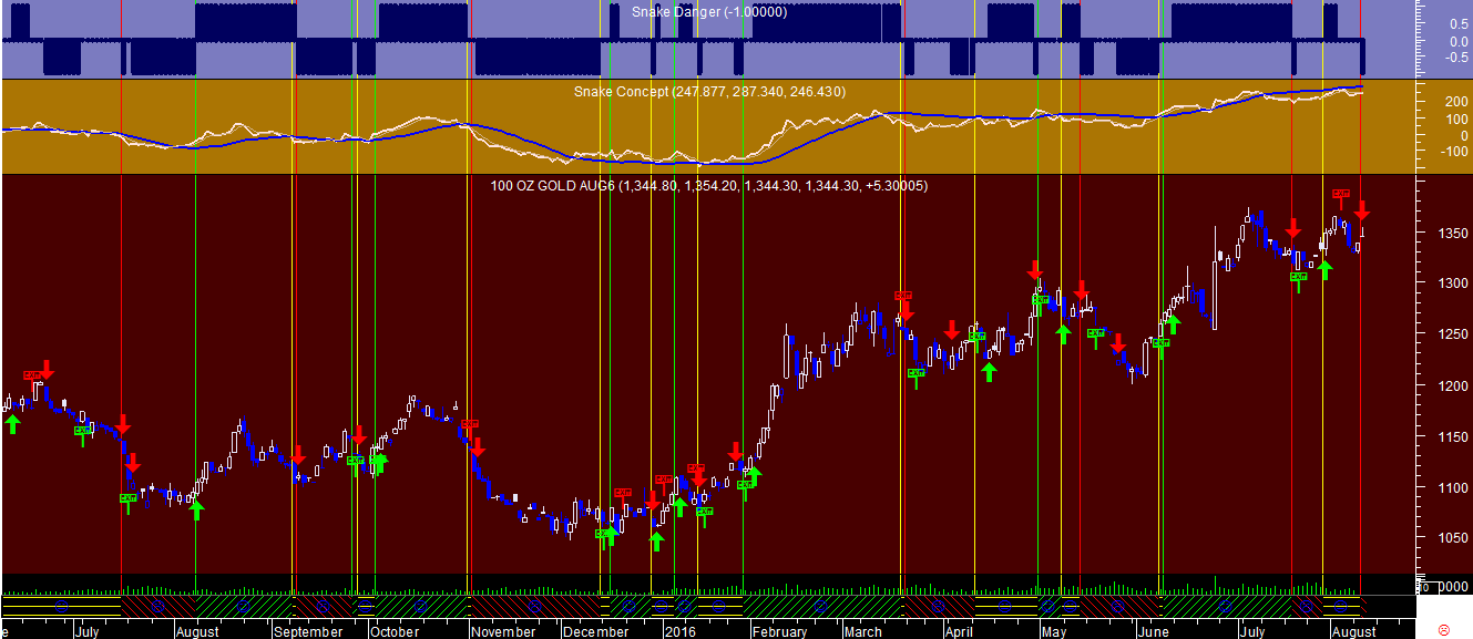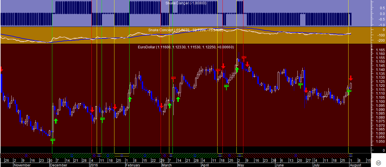 No gráfico do Ouro acrescentei hoje na parte superior o tal indicador chave do sistema de trading chamado “Rating Snake”, que analisa essencialmente as 2 vertentes do problema: o rating otimista, indicado pelo indicador verde bold e o rating pessimista marcado pelo indicador vermelho bold.