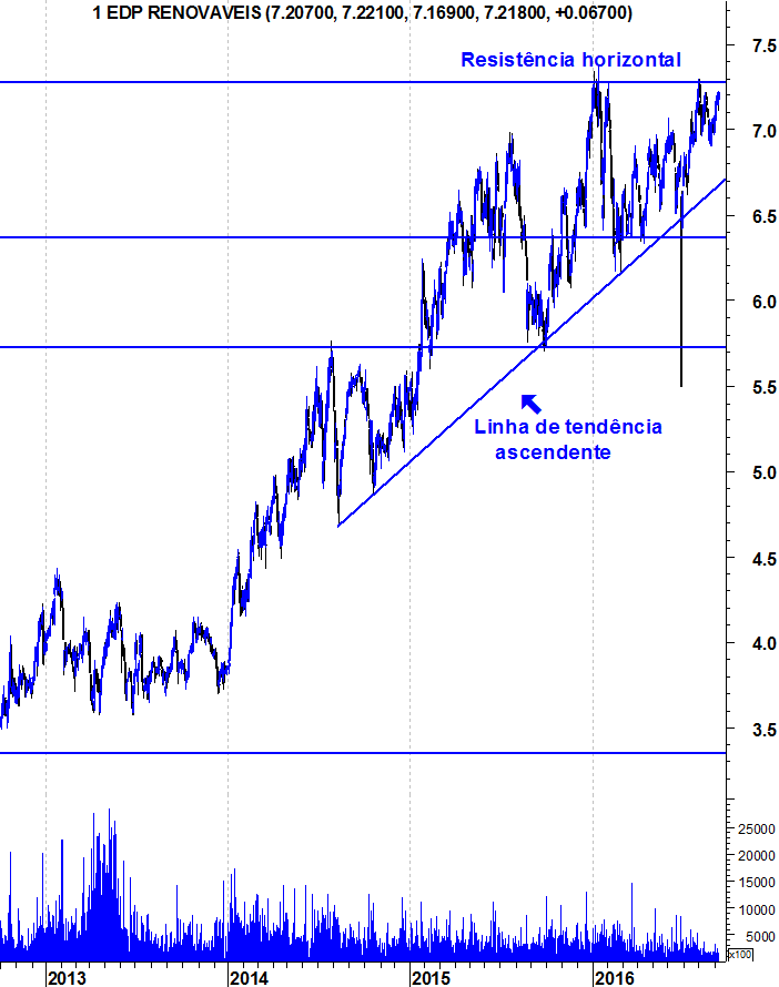 Ao longo do tempo, a linha de tendência ascendente e a resistência dos 7,25-7,30€ têm convergido para um ponto, como se de um vértice de um triângulo se tratasse, que quanto mais próximo fica mais restrito fica o intervalo de negociação dos preços. Na figura seguinte é perfeitamente visível esse fenómeno: