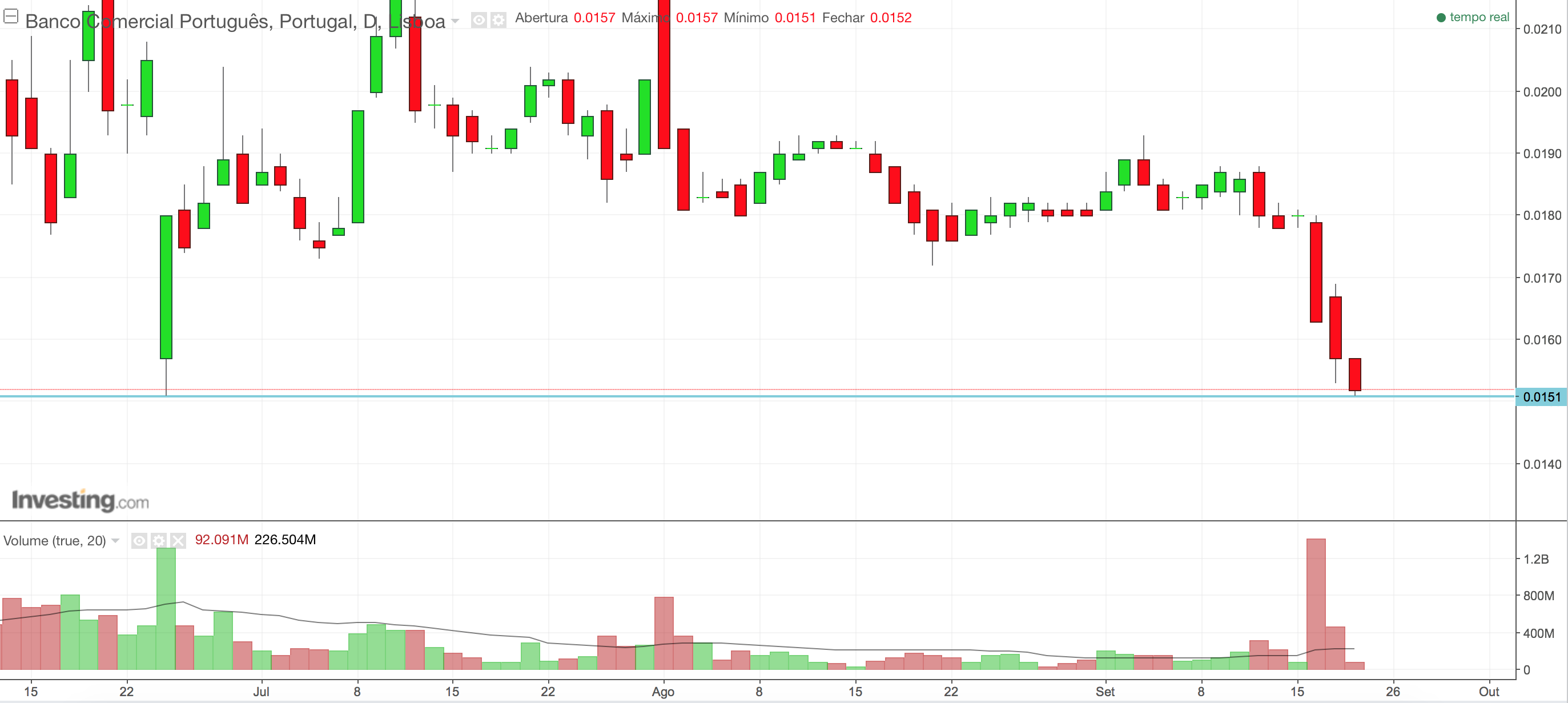 BCP novo mínimo desta semana 0,0151, já tenho desde 2.ªfeira ordem de compra BCP 0,011. Isto amanhã poderá aquecer e atingir novo mínimo histórico, mas isto de adivinhar fundos de uma cotada que está bearish é sempre complicado. :?: