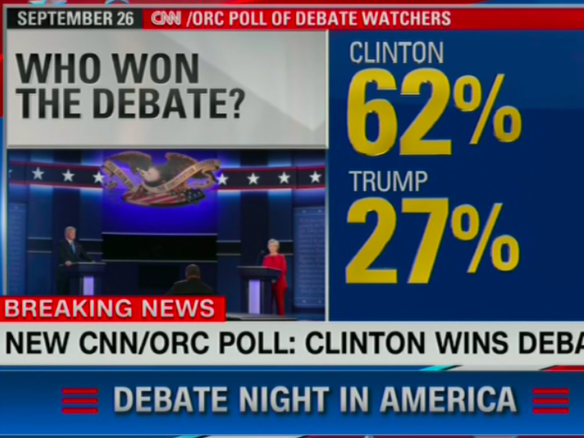 * A poll of debate watchers by CNN/ORC, which found that 62 percent thought Clinton won and 27 percent thought Trump did. CNN’s David Chalian emphasized on air that the sample was 10 points more Democratic than in a typical poll, but that’s still a strong win for Clinton.