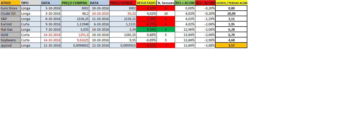 Nas 2 colunas finais do quadro anexo estará indicada a performance obtida acumulada, em resultados nao alavancados das trades positivas e negativas respetivamente. Há que chamar a atençao que o somatório incide sobre um potencial total de 13 (raios, que número, só agora reparei!) ativos diferentes, a saber: