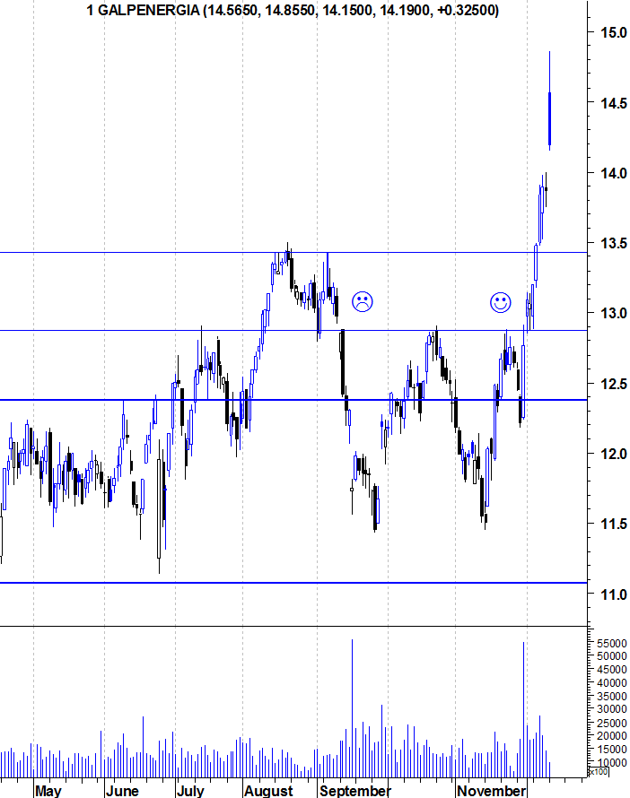 Tal como frisei no último "Discos Pedidos" que fiz sobre a Galp, depois de ter estado de fato de touro vestido durante muito tempo, despi-o por ver os primeiros sinais de fraqueza da acção. Ainda não é o suficiente para vestir o fato de urso (apenas se quebrar o suporte dos 11 euros), mas continuo a ver sinais de fraqueza que anteriormente nao via. Apenas voltarei a mostrar-me optimista em relação à acção se voltar a romper, consistentemente, a resistência dos 12,85 euros.