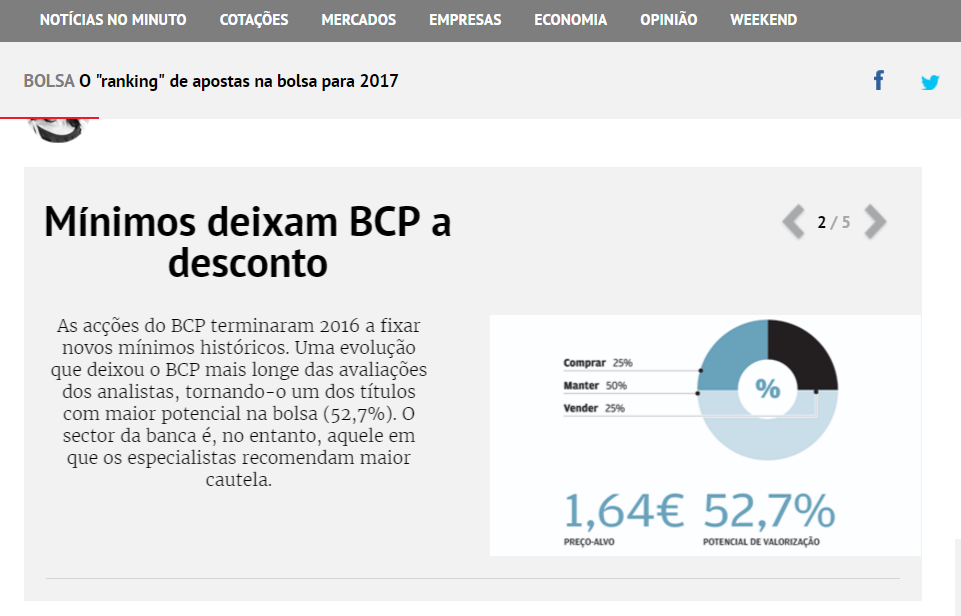 BCP em 2º lugar como o ranking das preferidas para potencial de subida para 2017.