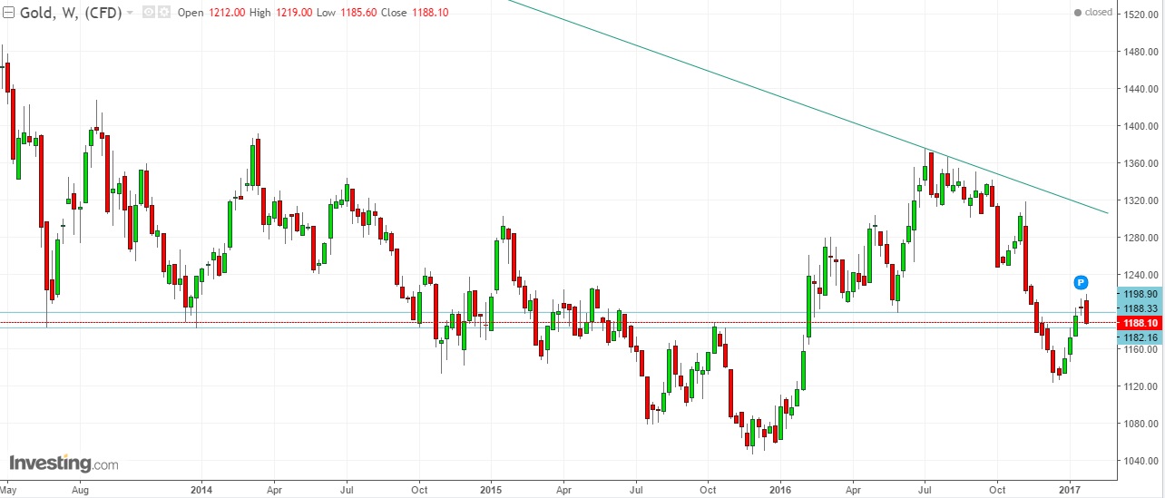 O preço do ouro parou sua alta em $ 1.220 como nós esperávamos de $ 1.120. Um recuo é justificado. Eu prefiro ver o movimento do preço para $ 1.160 e a retração de Fibonacci de 61.8% de todo o aumento e, então, reverter para cima para $ 1.300.