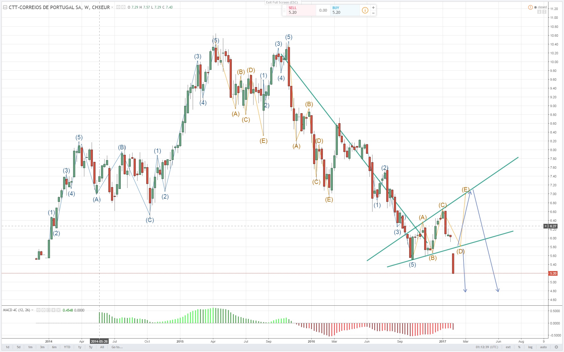 Tem tudo para estar a cotar na zona dos € 5,50 - € 5,65, antes de mergulhar abaixo dos € 5,00. Isto é, se mergulhar abaixo desse valor![]()