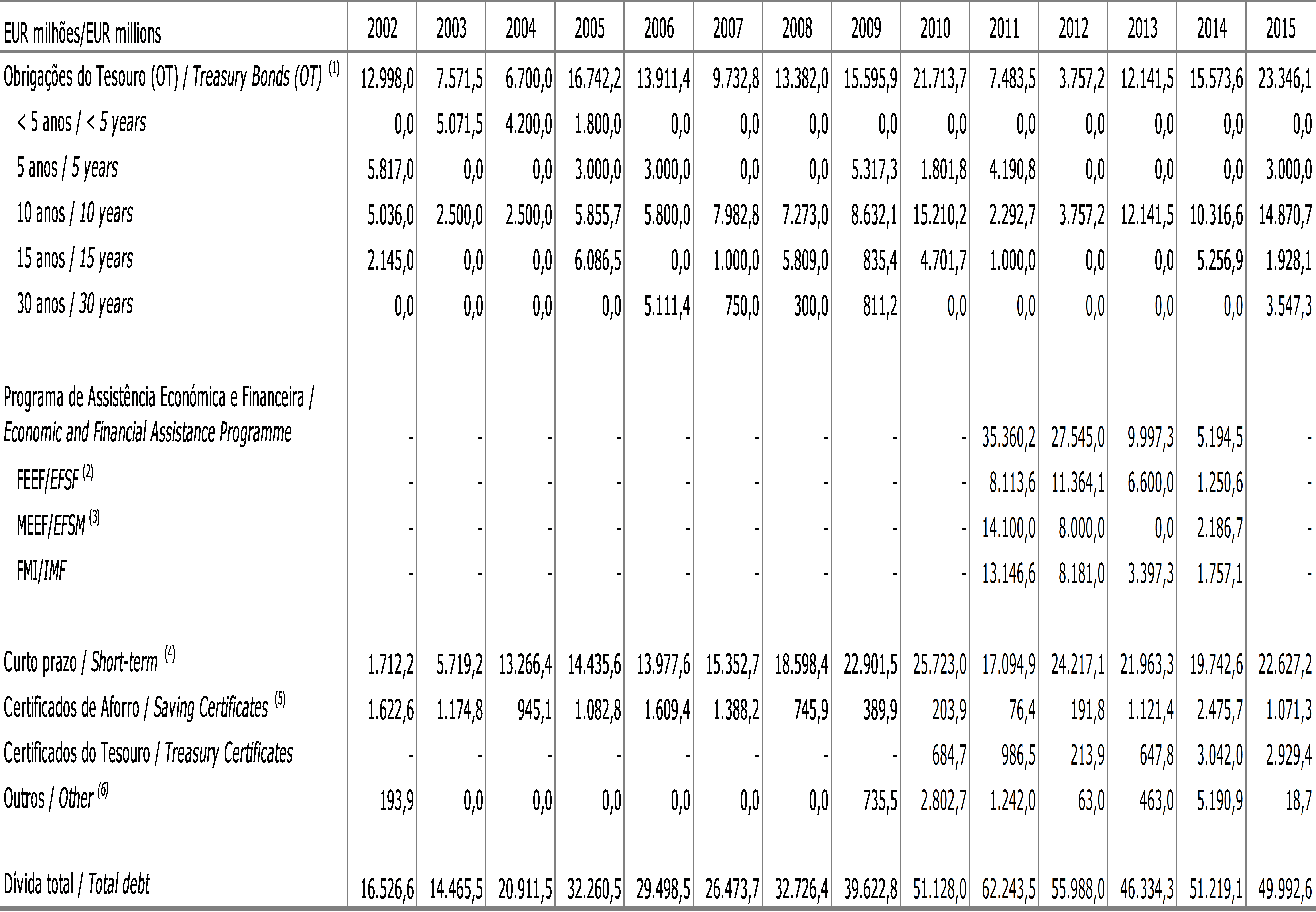 Sobre o mix da dívida pública portuguesa, anexo dados a 2015, onde se podem verificar 4 factores: Dentro do Mix, reforçam-se Prazos longos quando o risco da república é estável ou baixa, o reforço no mix actual actual da captação de pequenos aforradores e da Segurança Social, o reforço dos prazos médios, inferiores a 5 anos e inferiores a 2 anos em épocas de maior risco/incerteza, e o impacto "salvador" dos fundos especiais da Troika.