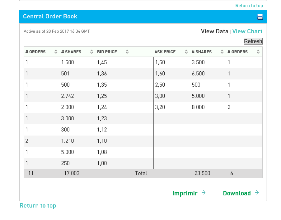 Isto tem consequências engraçadas. Repara que os limites (para o leilão de amanhã às 10:30) são 1,16 a 1,40. Se eu amanhã desse uma ordem de compra ao melhor de 5000 acções, supondo que estavam as mesmas ordens que agora, acontecia o seguinte: